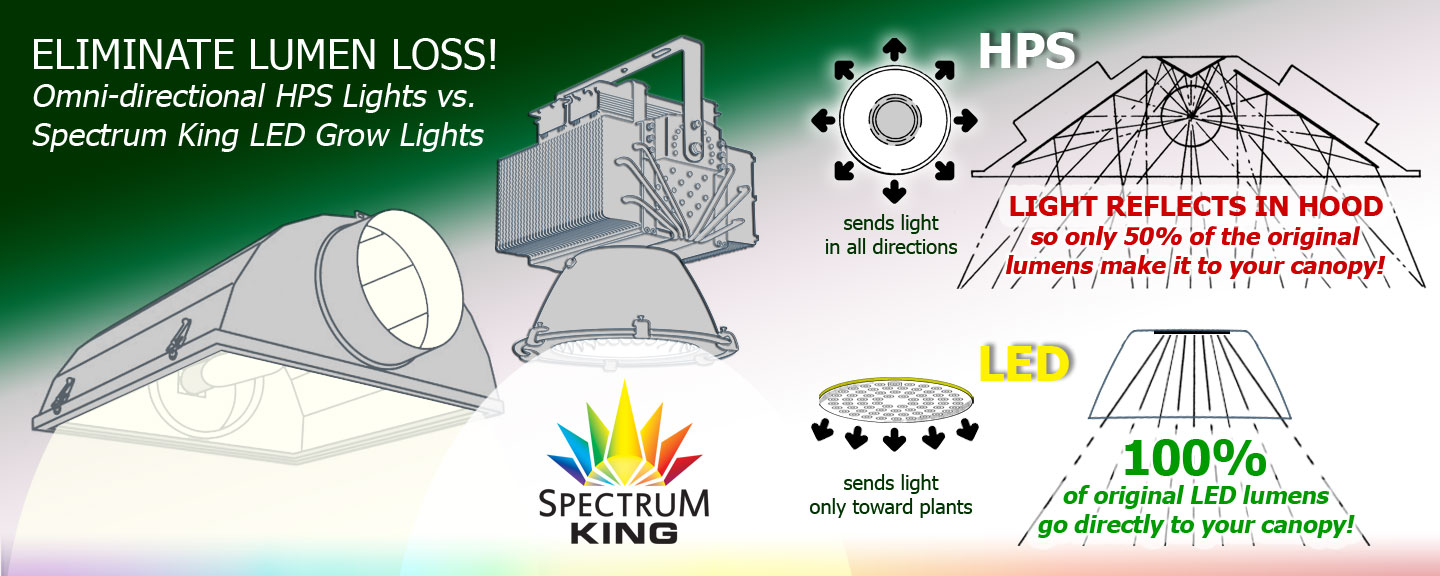 That’s why when you hold a meter to a Spectrum King 400 Series LED Grow Light and a 1,000 Watt HPS at the plant level, the PPFD readings match. PPFD and lumens will be relative when you measure between two sources like this. The only reason LED can achieve the same result with a much lower “Lumens” value is because it is a directed light source - same as the street lights. The Metal Halide and HPS lamps produce triple the lumens, but LEDs provide the same amount of light when measured at the street; same thing with your plant canopy and cannabis.